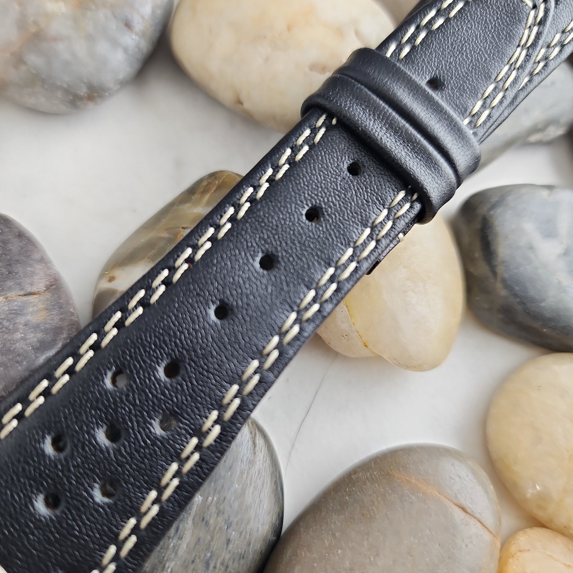 Our fifth strap is called the Doppio Buco. This strap is manufactured using our Decantare line calfskin. We have put in place a double row stitch pattern along with preforated holes similar to the Audemars Piguet Royal Oak Offshore Barrichello 2 strap.