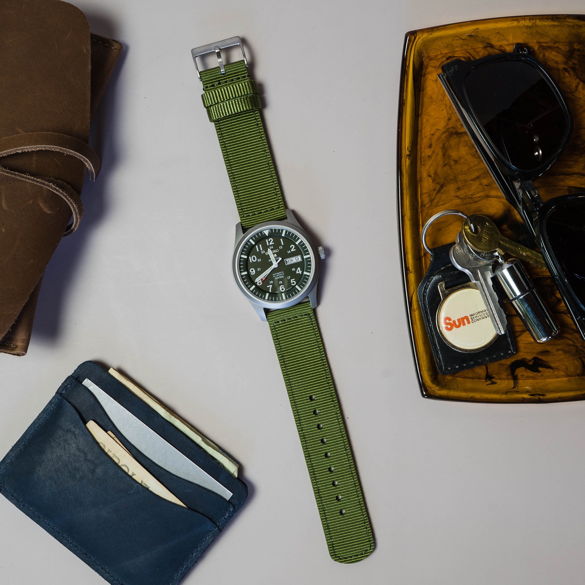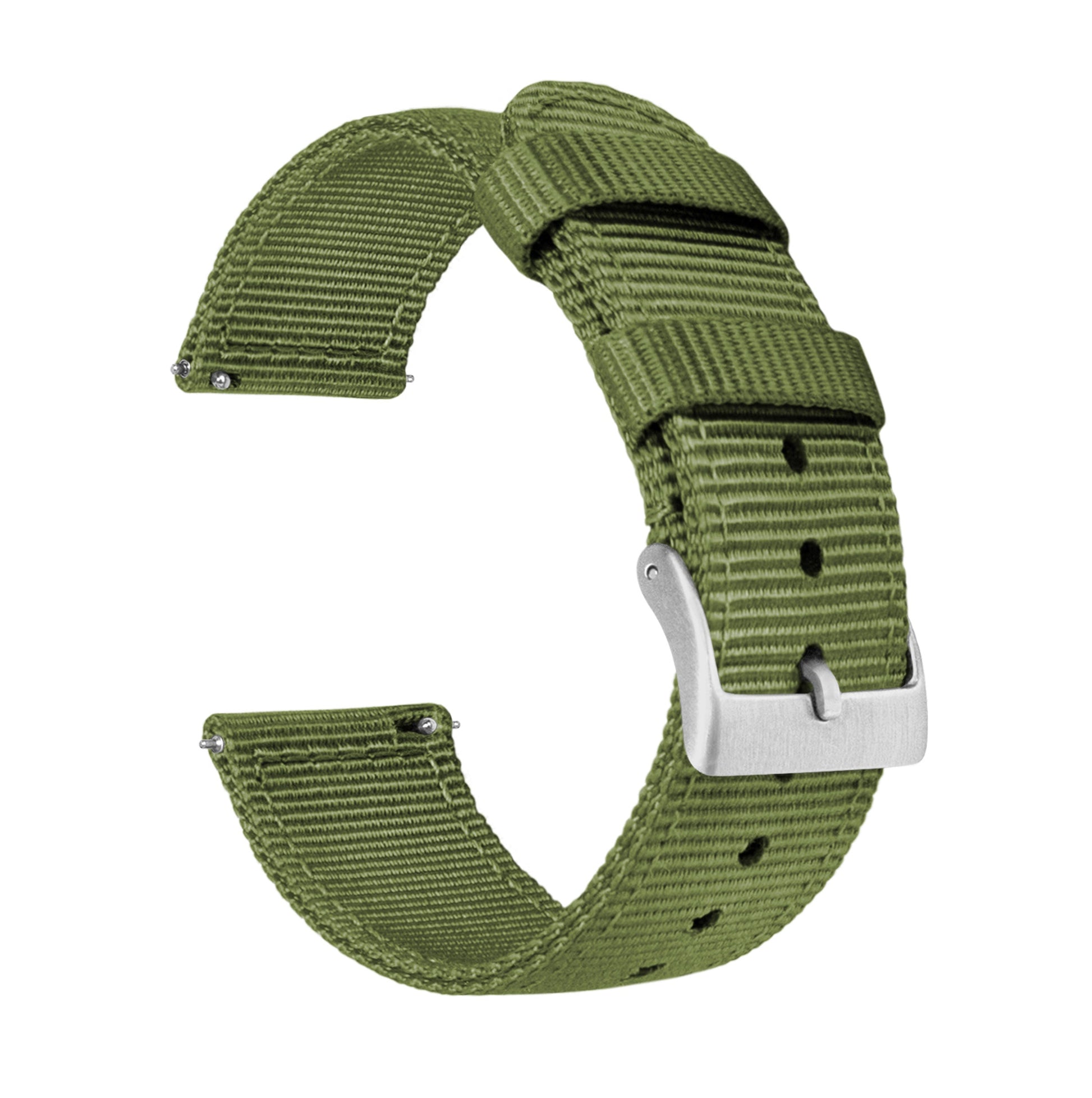 Our Two-piece NATO® -style straps allow you to enjoy the classic look of a NATO®-style strap without having to forego the quick-release functionality. These nylon watch bands are water-resistant, colorfast, and feature two nylon keeper loops for a more comfortable fit. Please be aware that due to the sturdy dual-layer construction, our two-piece NATO®-style straps do have a stiffer feel that softens up over time. As always, these feature 316L stainless steel hardware with a brushed finish and quick release spring bars. Add some color to your strap collection with our selection of fun twelve colors and patterns.