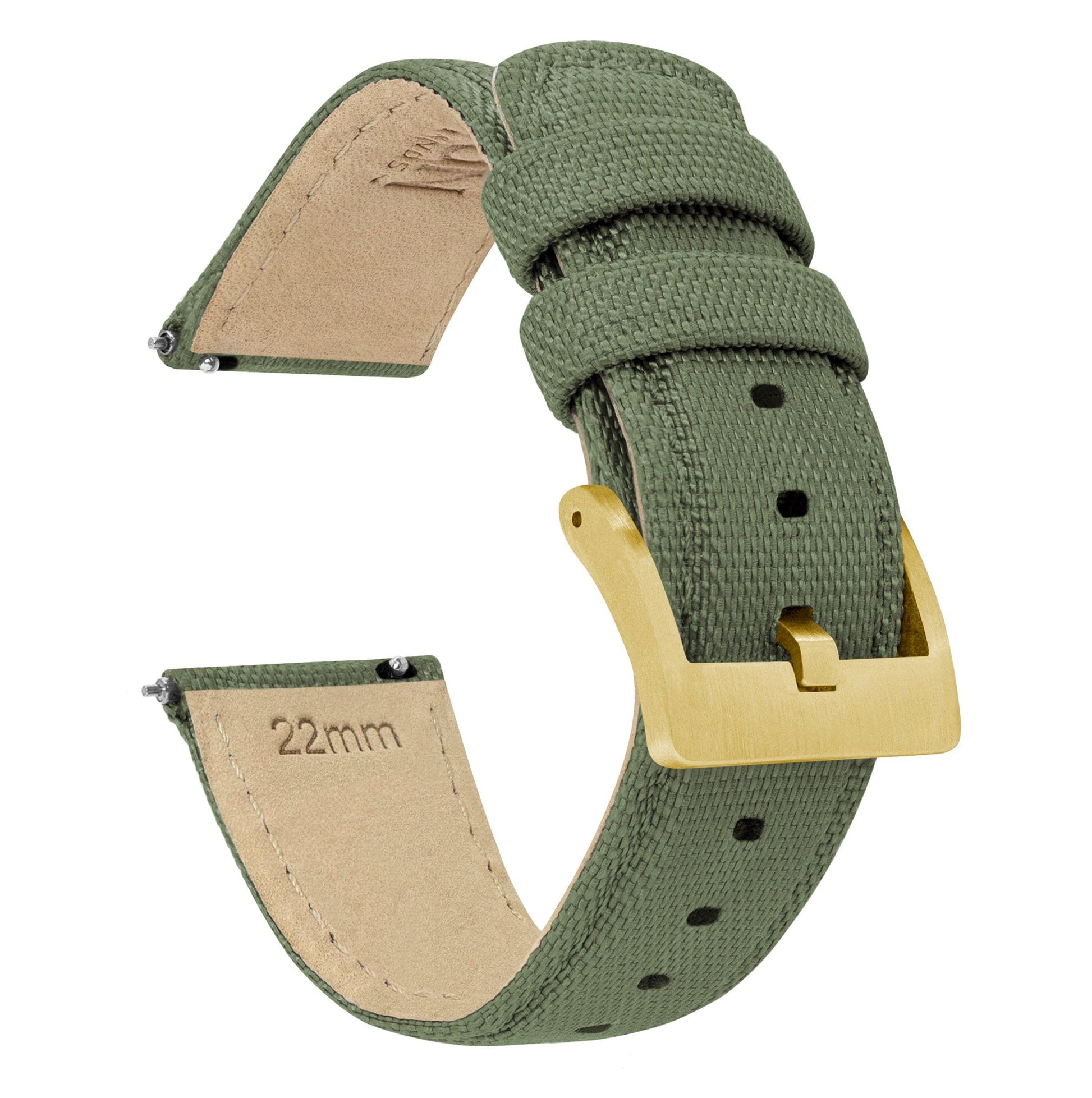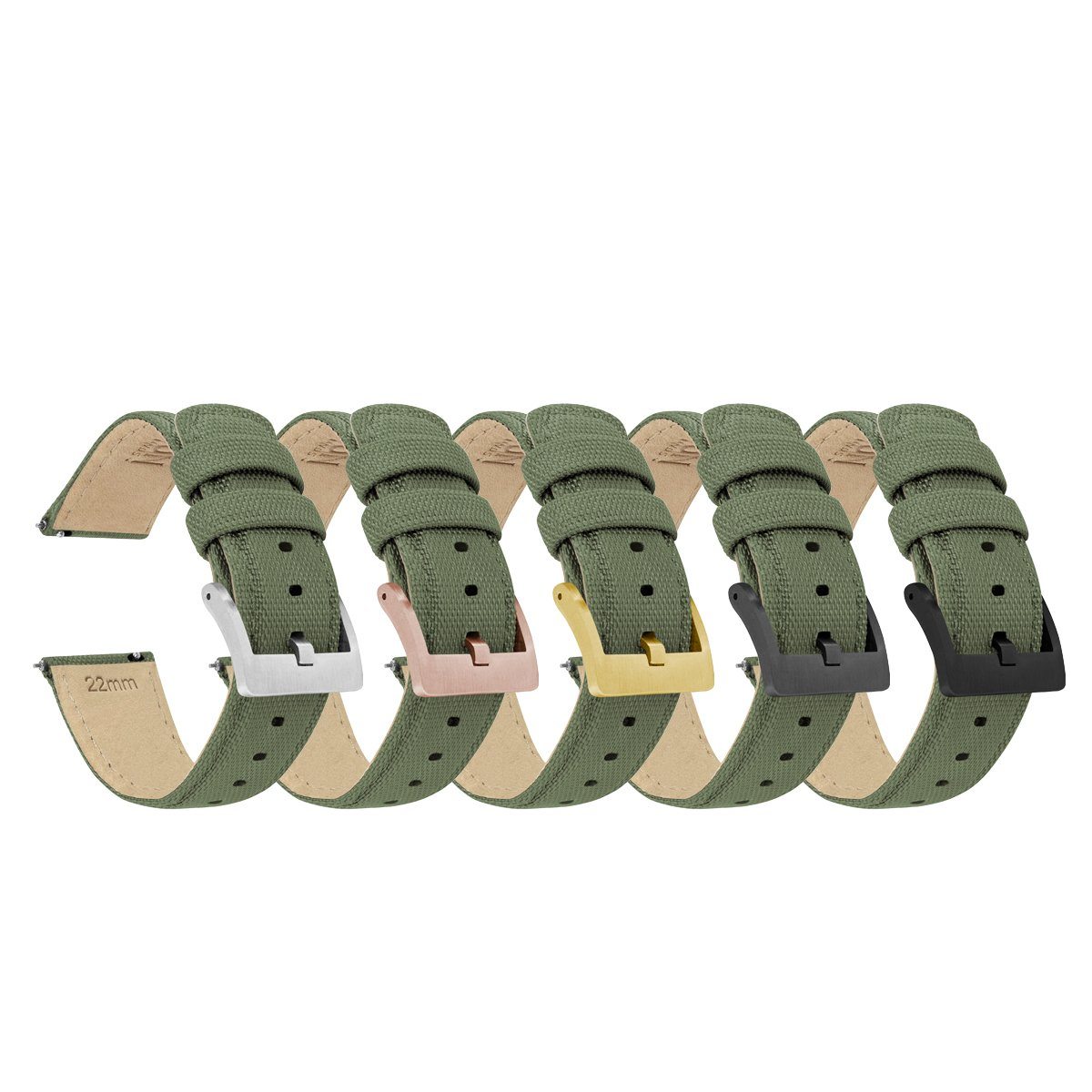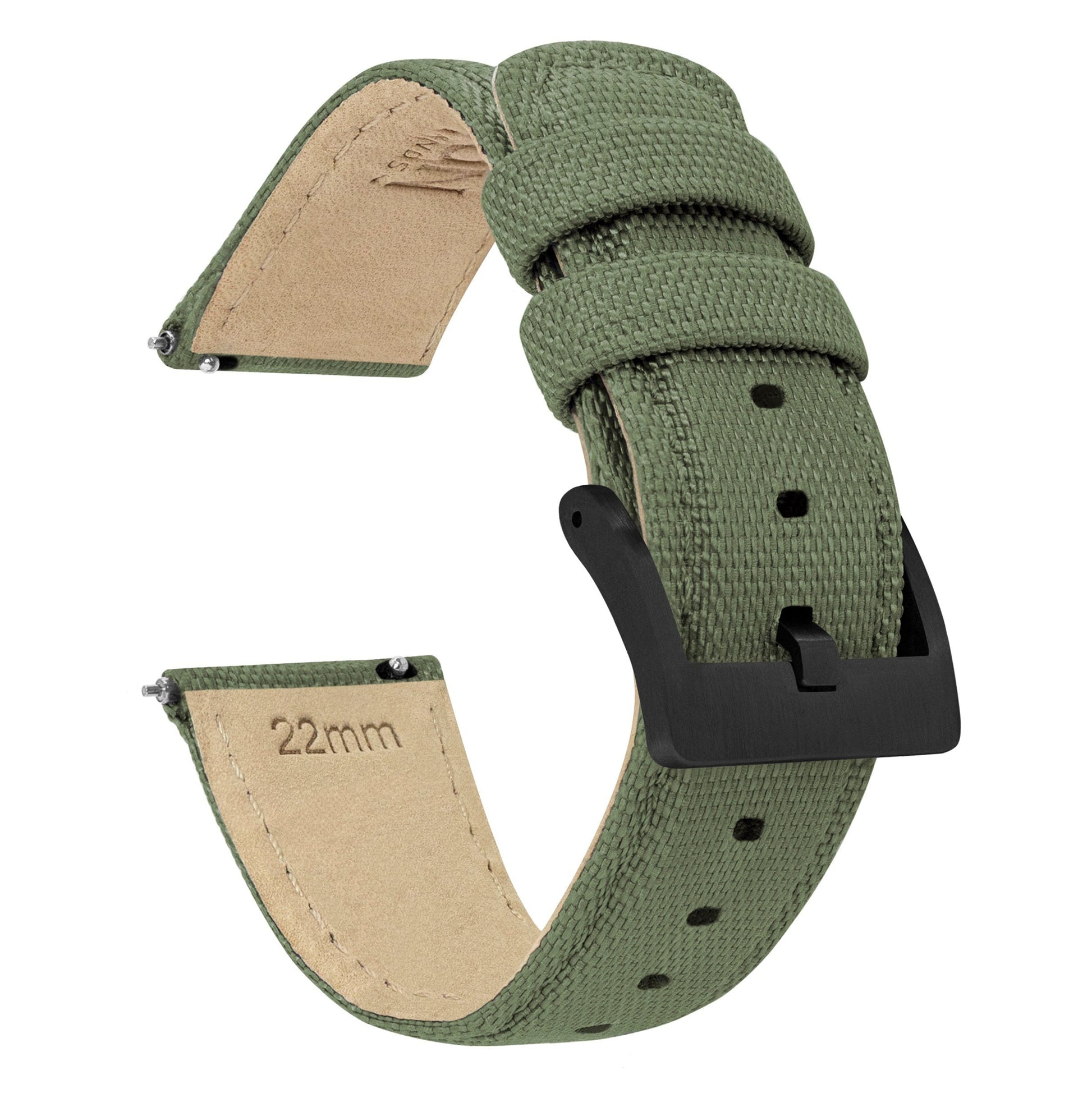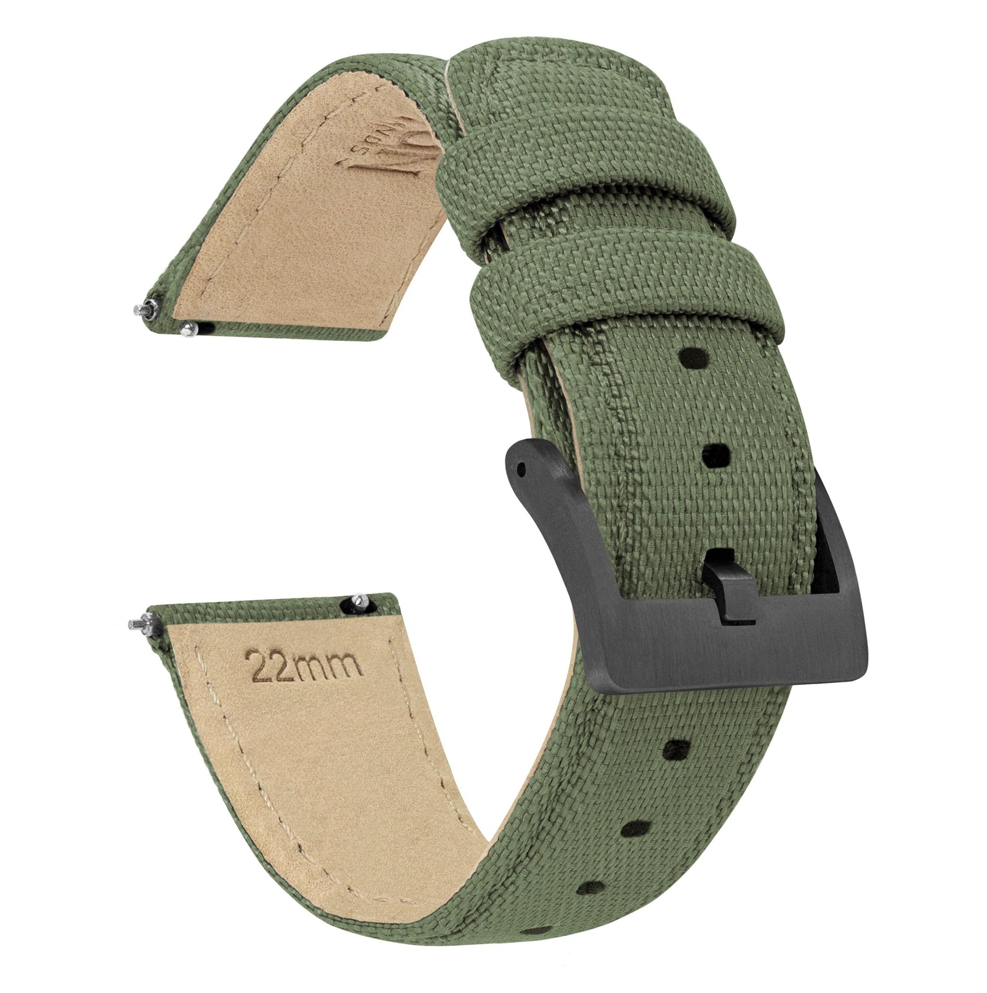Our army green Sailcloth Quick Release watch band features a premium nylon weave with smooth leather backing. Each band is designed with padding for comfort and durability, a 316L surgical grade brushed stainless steel buckle, and a 2mm taper from watch head to buckle. Swap out in just a few seconds and without tools! Pair this sailcloth watch band with our Leather, Elite Silicone or Canvas quick release bands to take full advantage of the opportunity to 'Switch it Up' on the go.
