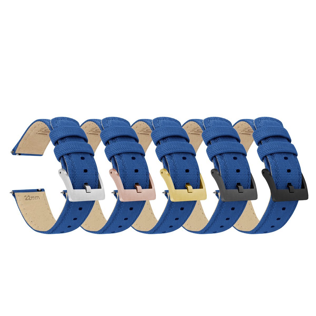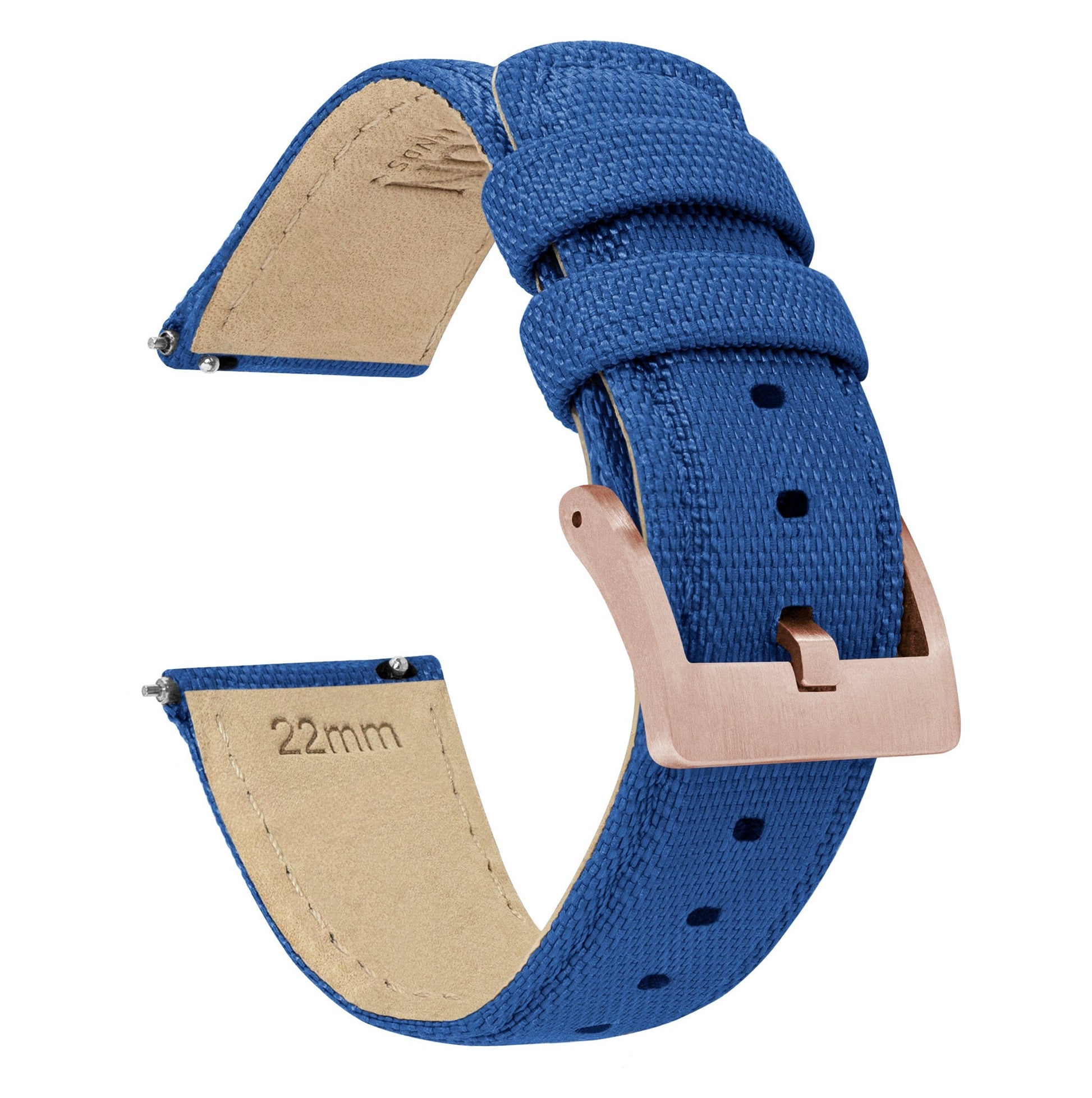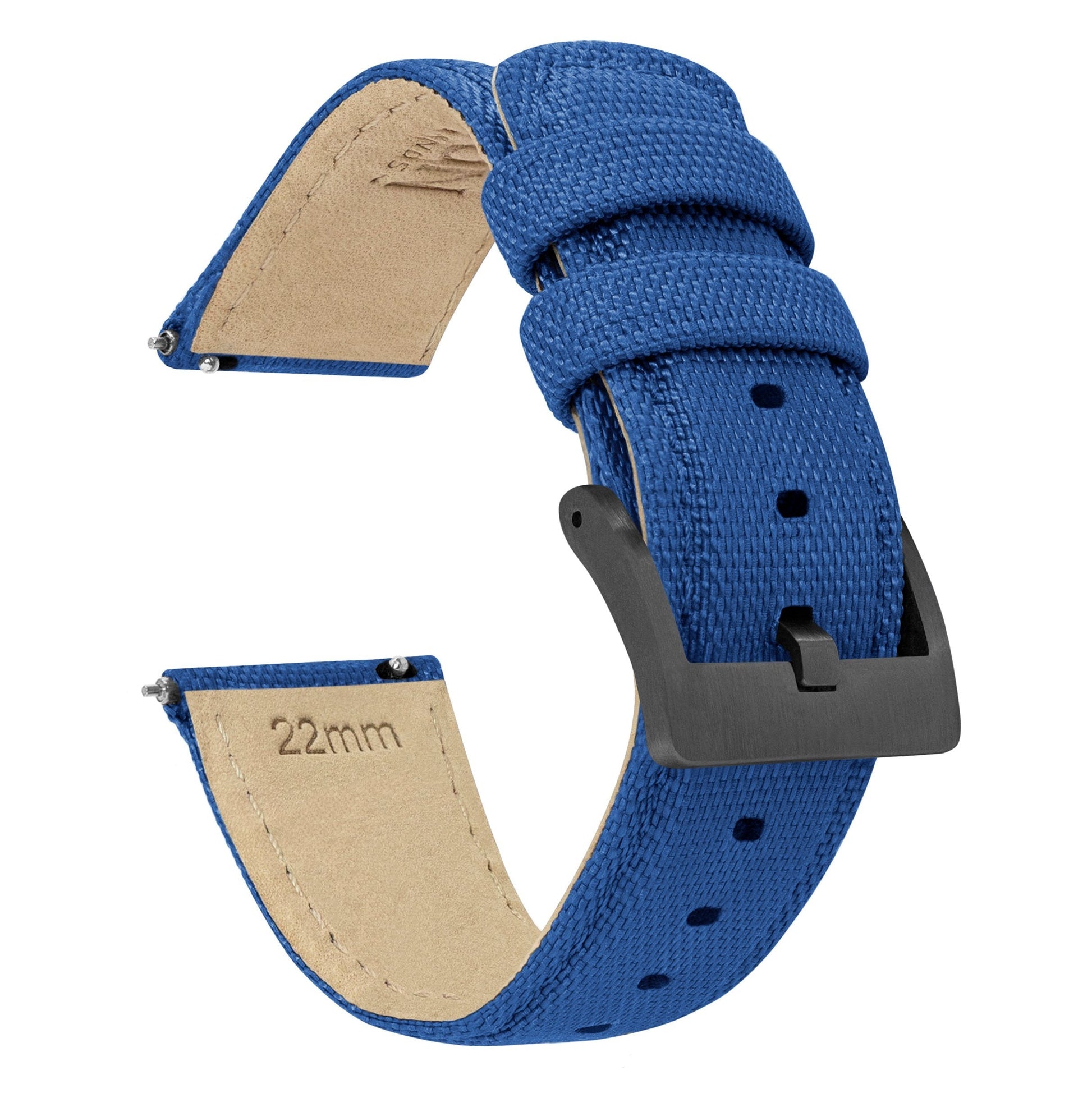 Our royal blue Sailcloth Quick Release watch band features a premium nylon weave with smooth leather backing. Each band is designed with padding for comfort and durability, a 316L surgical grade brushed stainless steel buckle, and a 2mm taper from watch head to buckle. Swap out in just a few seconds and without tools! Pair this sailcloth watch band with our Leather, Elite Silicone or Canvas quick release bands to take full advantage of the opportunity to 'Switch it Up' on the go.
