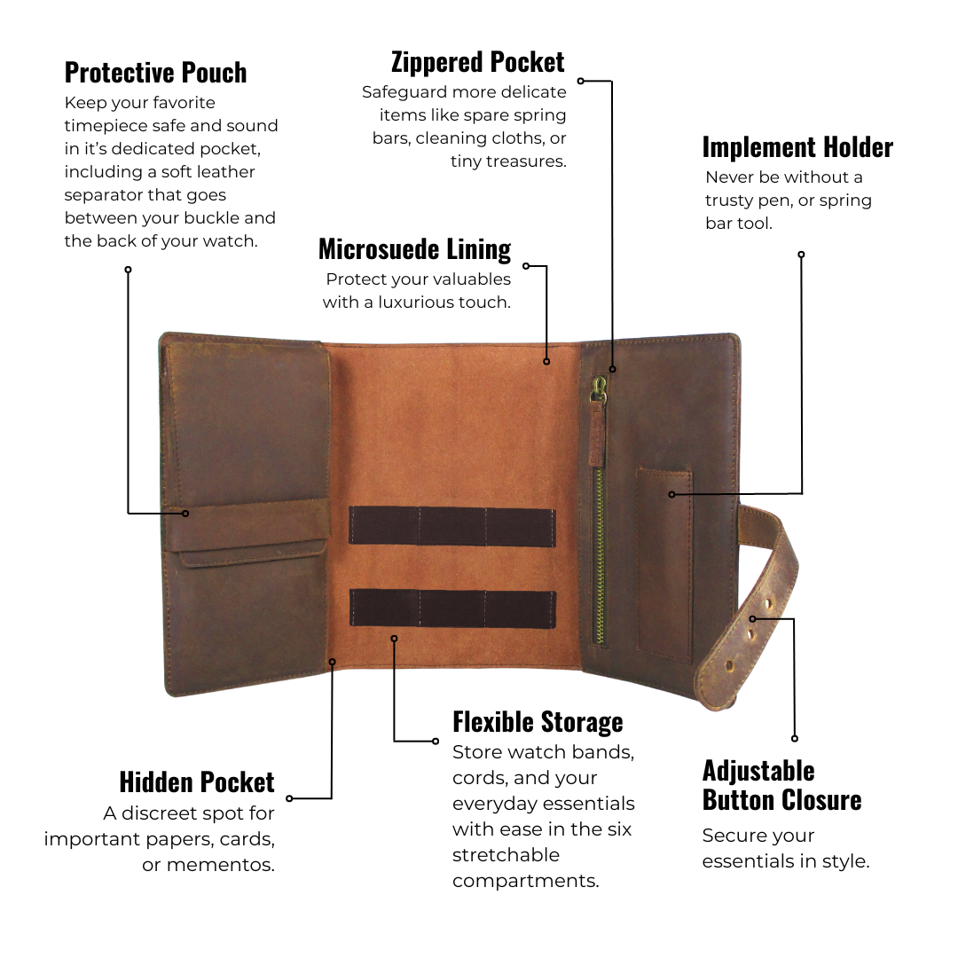 Zippered Pocket: Safeguard more delicate items like spring bars, cleaning cloths, or tiny treasures.
