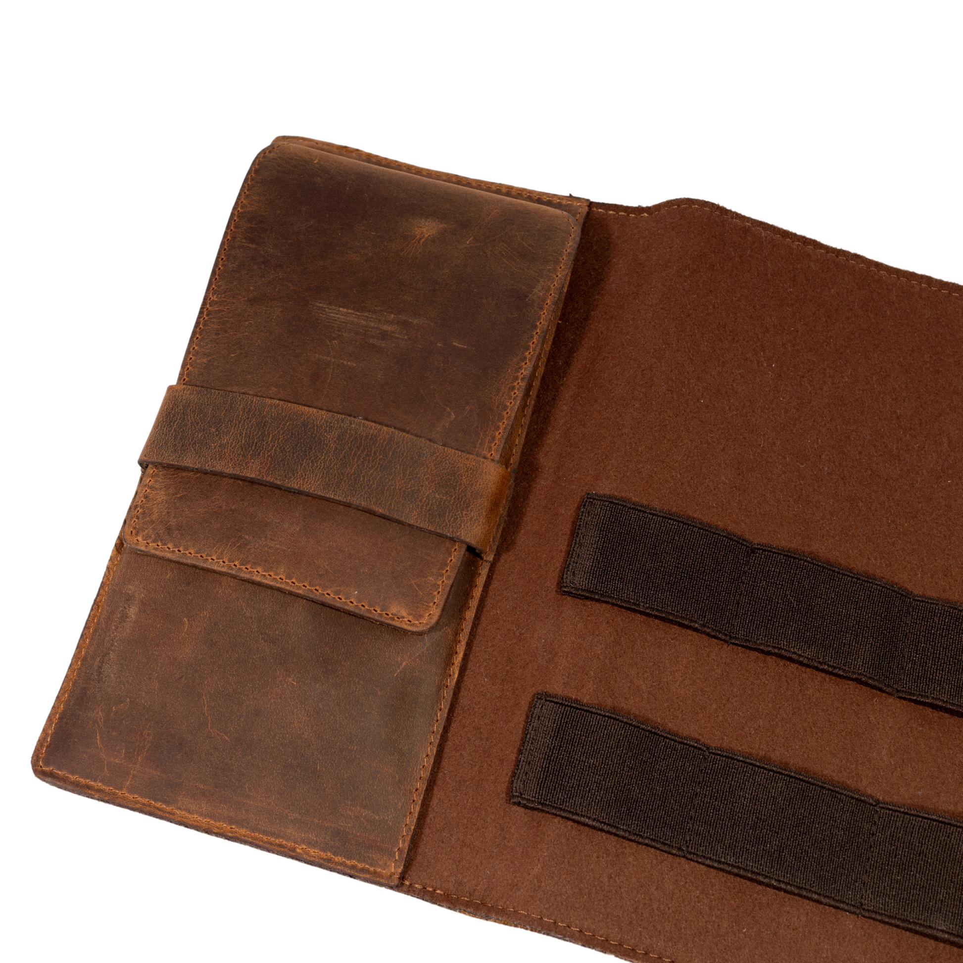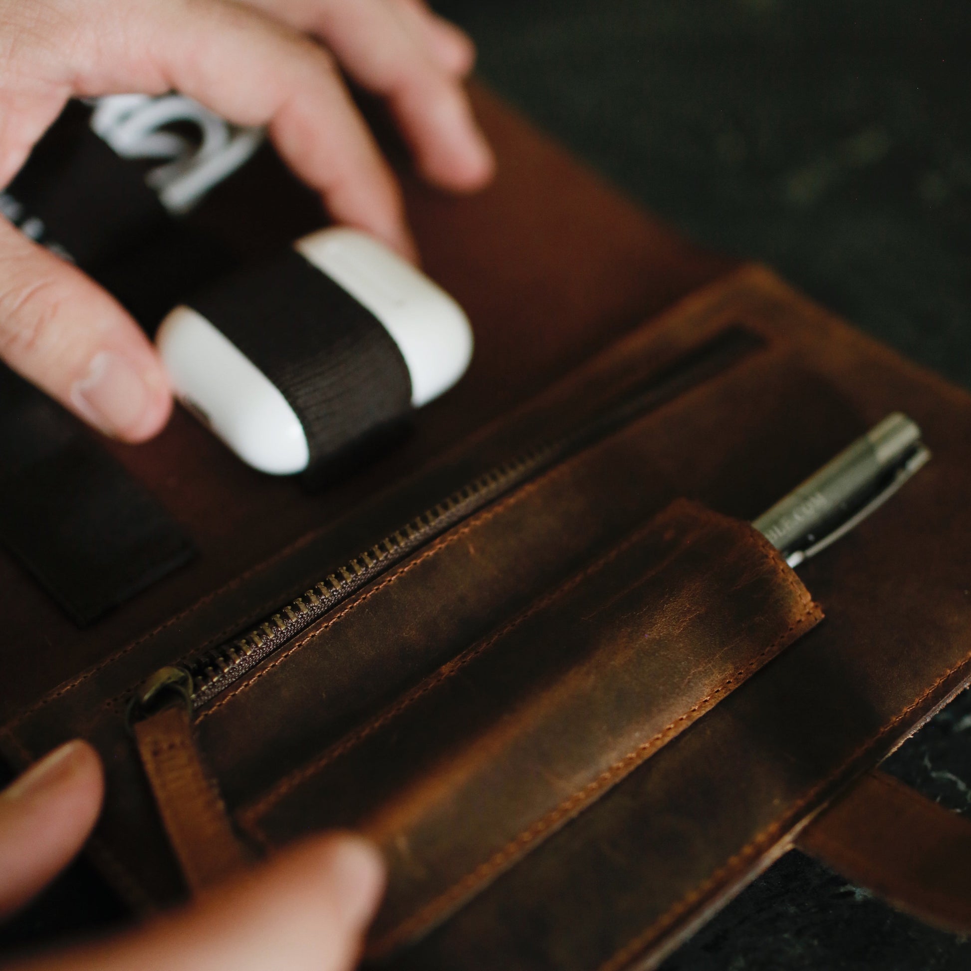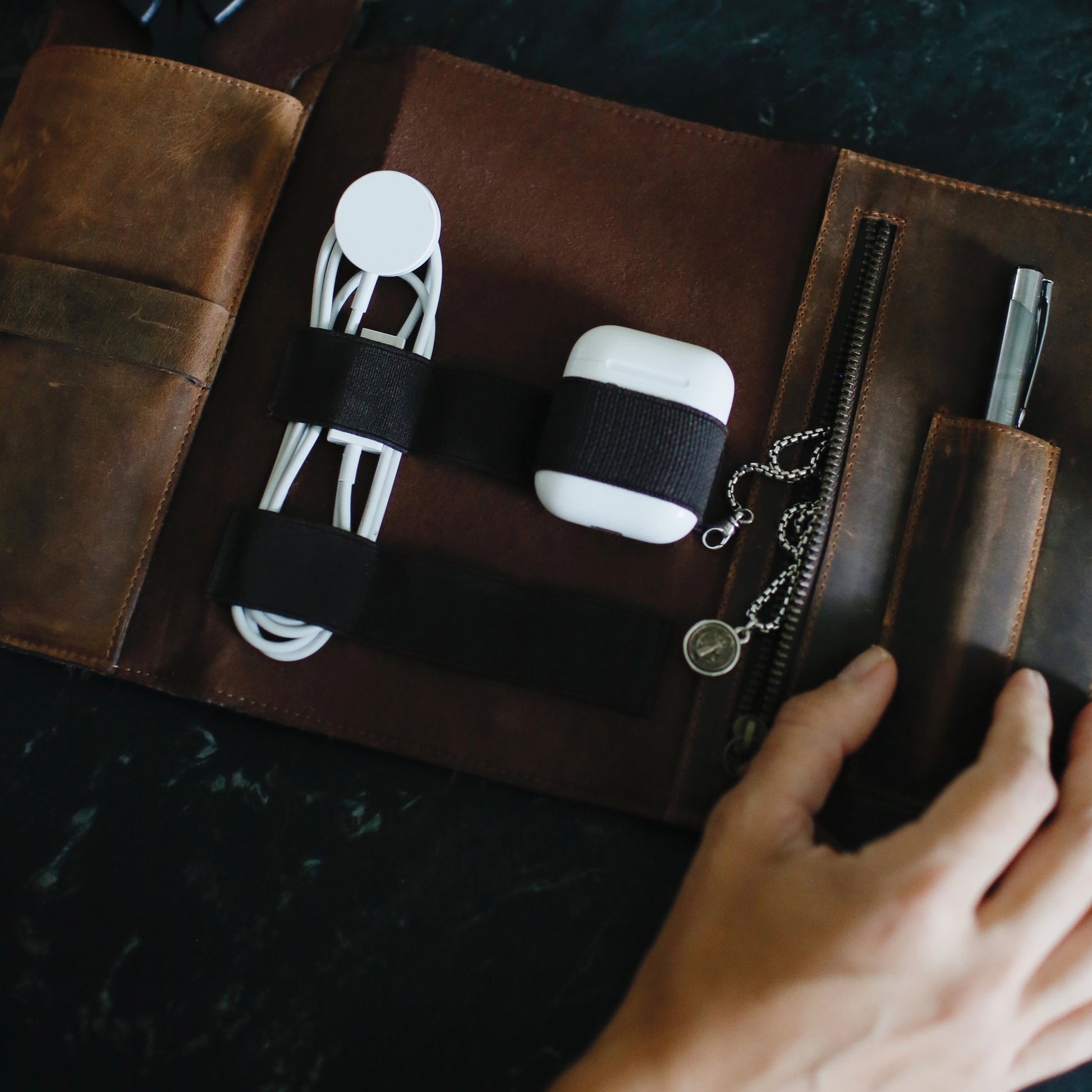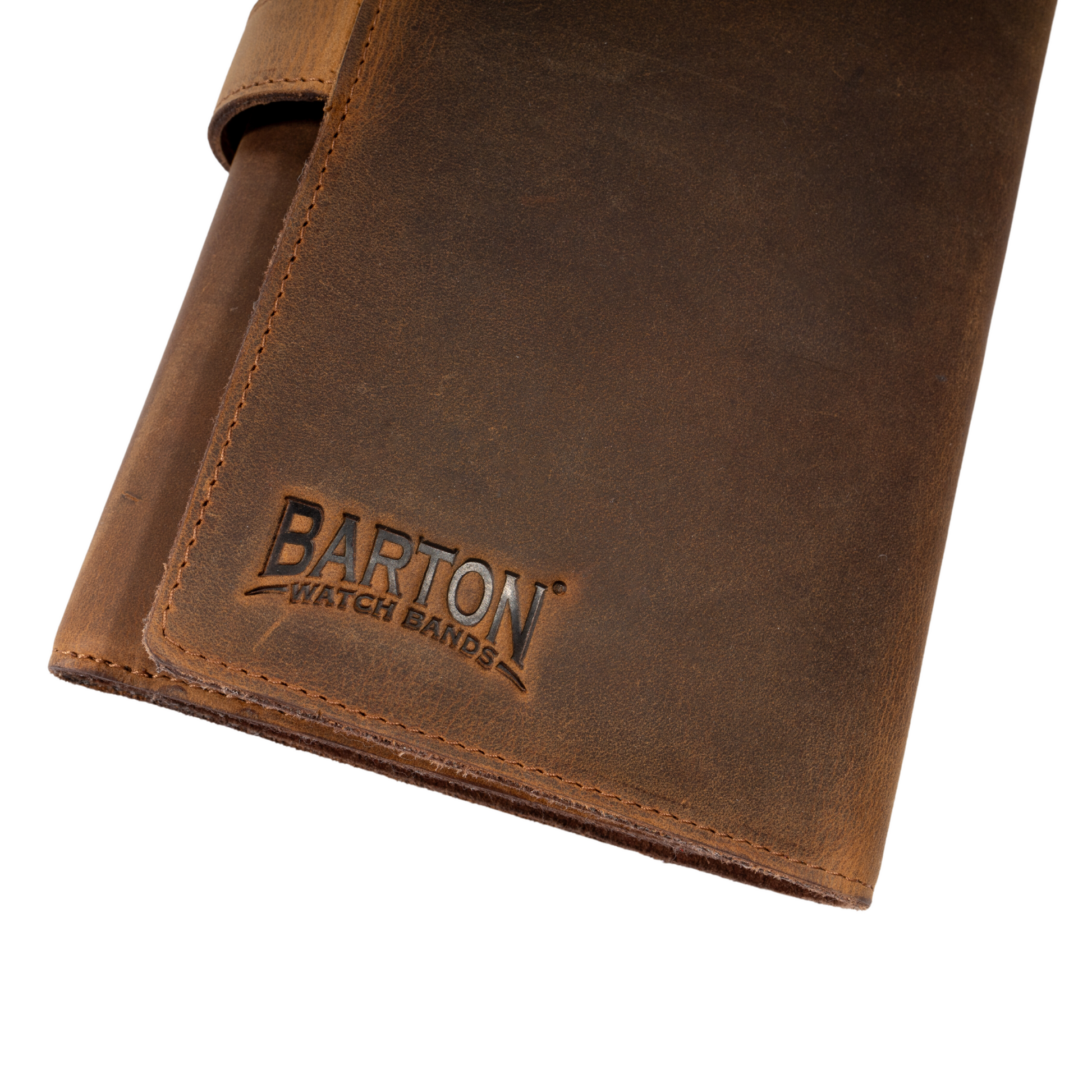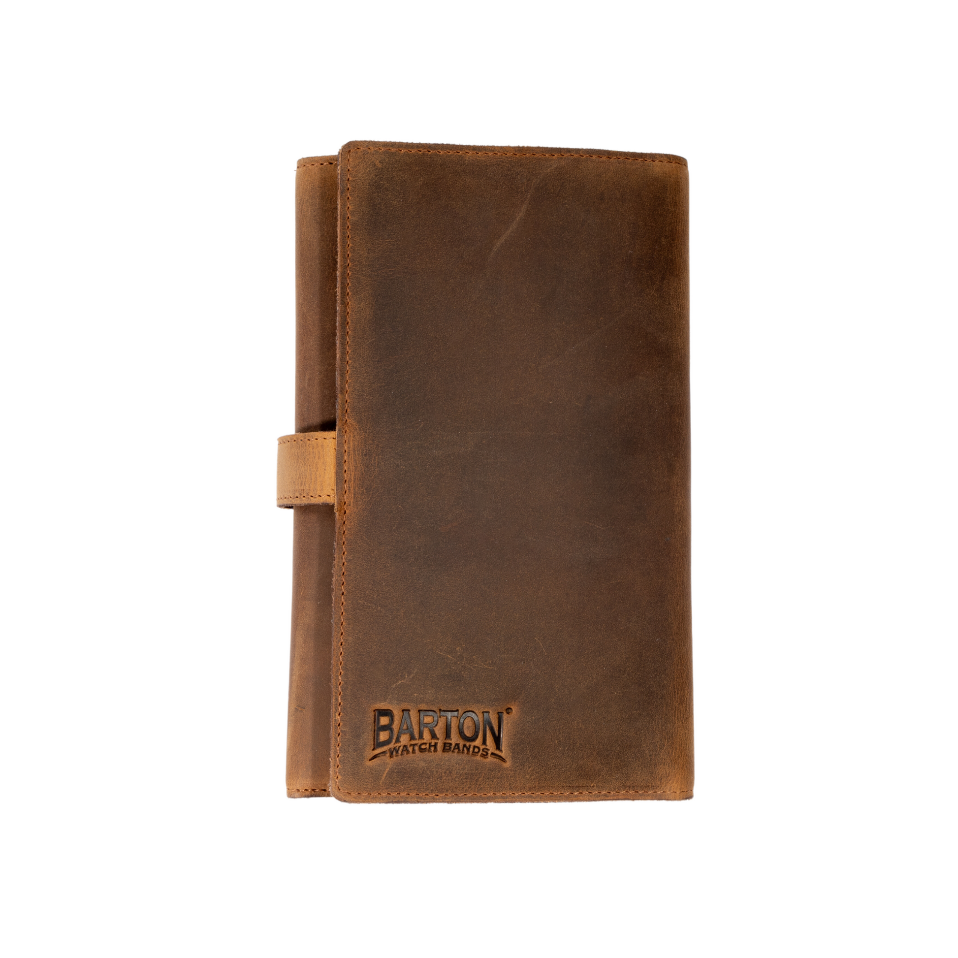 Barton Watch Bands' sleek tri-fold leather travel bag is not your ordinary travel accessory. It's the perfect blend of style and utility, designed to make your adventures and daily life a breeze with Barton's leather tech organizer watch band and accessory storage for travel.