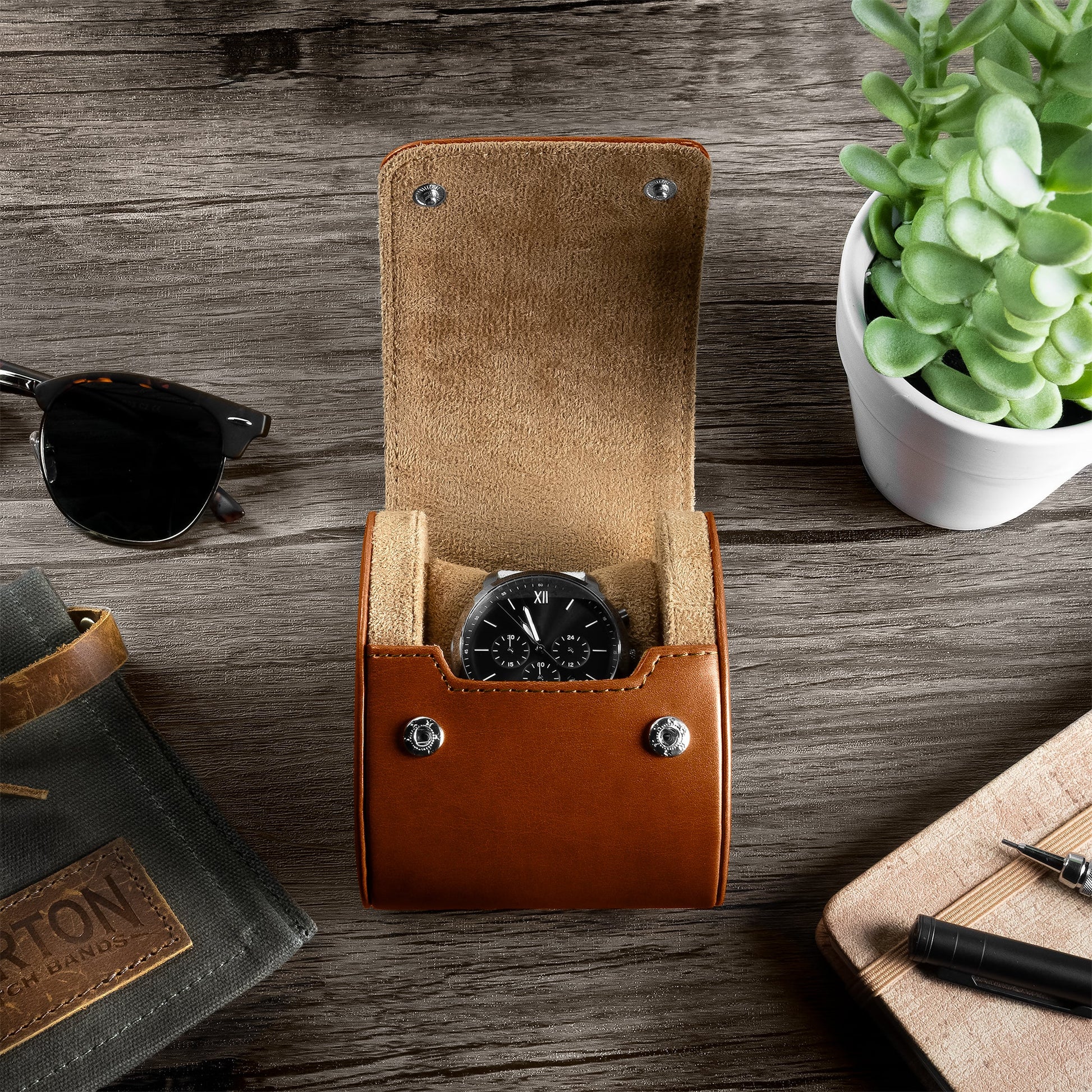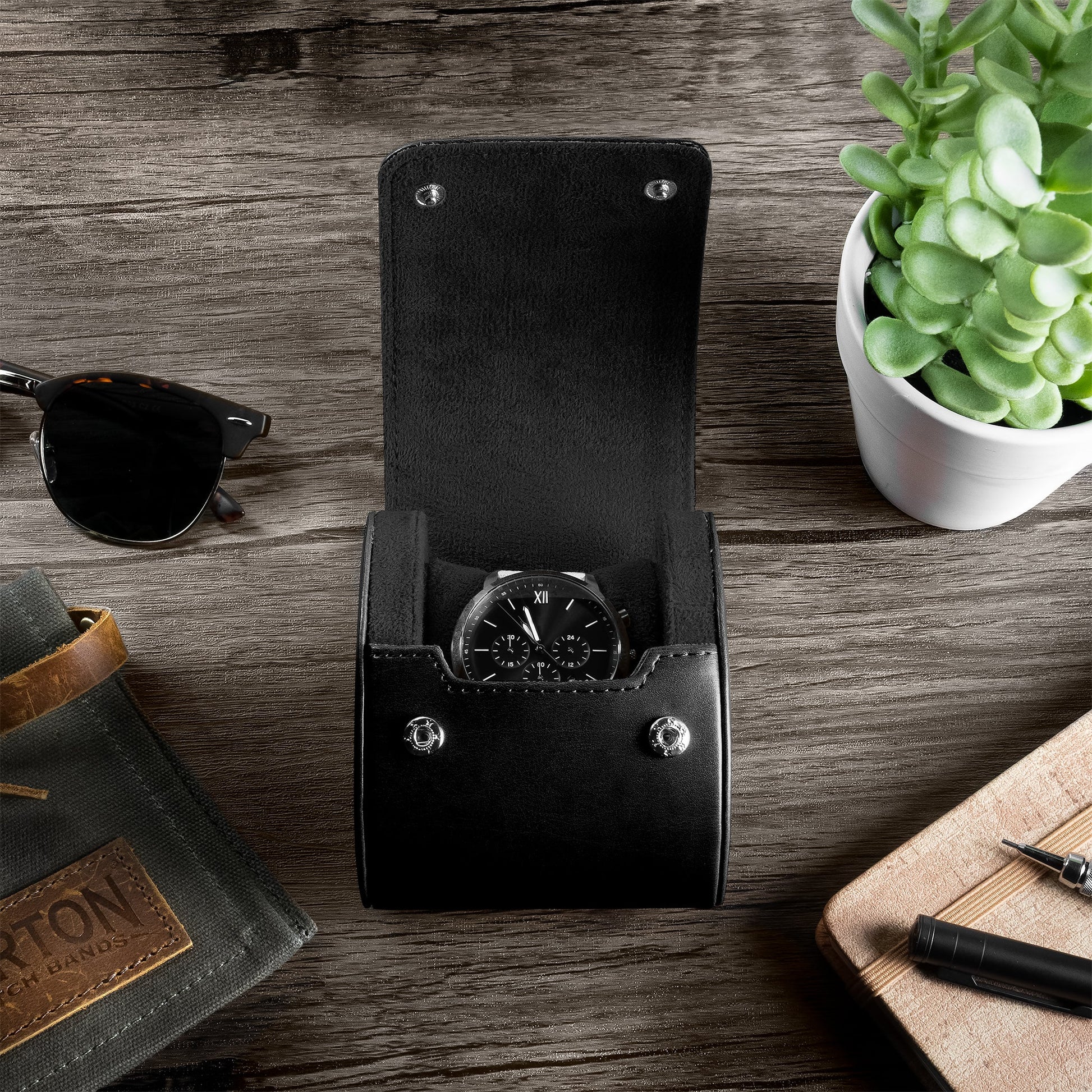 When it comes to measuring time, we know you’re looking for the perfect product that will help you conquer your mission in style with no compromises. Introducing our Recycled Leather Watch Roll Travel Case; A smooth recycled leather case that protects your watch wherever you go. Featuring luxurious stitching, this sturdy case is durable and stylish. With a sleek look and top-of-the-line materials, our Recycled Leather Watch Roll Travel Case is a portable solution that makes watch separation anxiety a thing of the past.