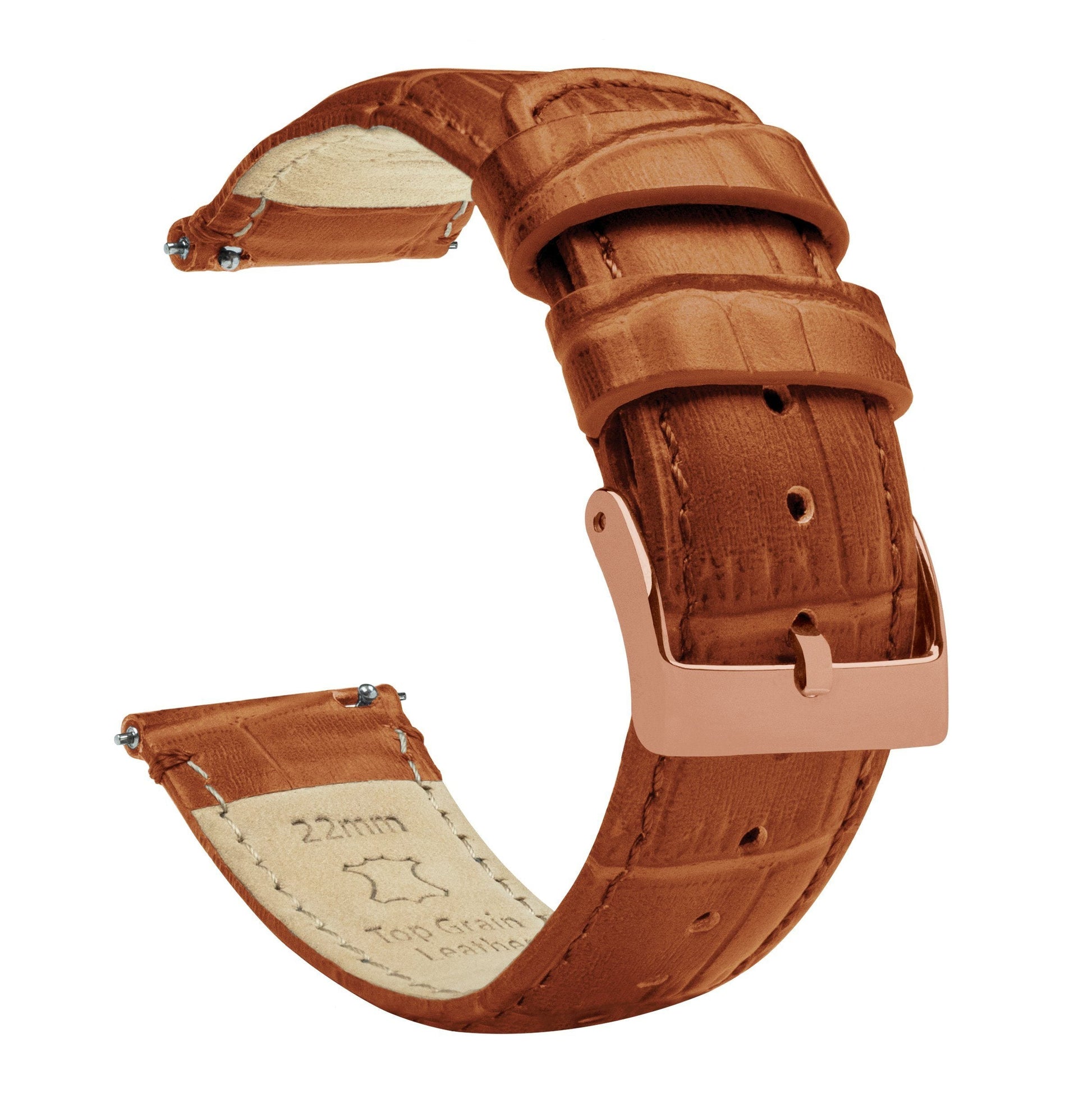 Our toffee brown Alligator Grain Leather quick release watch bands feature a 2mm taper from watch head to buckle and are padded for style and comfort. Crafted from hand-selected top grain leather and embossed with premium alligator texture, these straps are sure to be the envy of your town (or at least your break room). Pair with our Silicone or Canvas Quick Release to take full advantage of the opportunity to 'Switch it Up' between your office and the gym.